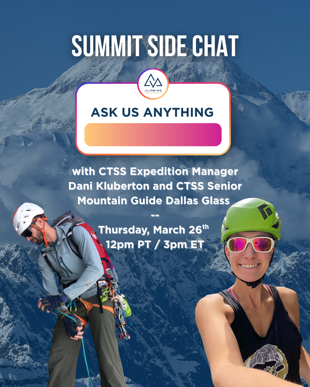 Summit Side Chat: Ask Us Anything is a live, open conversation with the CTSS team designed to address the questions climbers are actually asking. CTSS Expedition Manager Dani Kluberton and Senior Mountain Guide Dallas Glass draw from years of experience managing and guiding expeditions around the world to talk through the most common roadblocks climbers face when committing to an expedition, preparing over months, navigating uncertainty on the mountain, and reflecting afterward.
