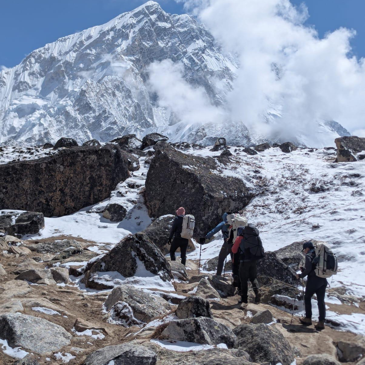 Our first Everest Base Camp trekking team, under Kat Schaumberg’s guidance, is at Gorakshep, which is the last village outpost on the entire trail to Everest Base Camp. Tomorrow, they will arrive at Everest Base Camp, and all are excited to reach their goal. Over the last few days, they’ve been navigating the glacial moraine in misty weather with our Sherpa guides, who know the route like the back of their hands. When the weather is socked in, it’s easy to make a wrong turn in a world of grey and white!