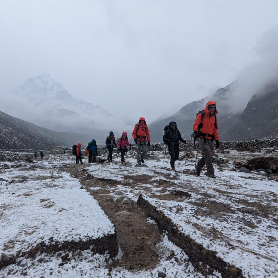 Our 3 Peaks team, led by Porter Crockard and Phunjo Lama, checked in today from Chukkung. With snow continuing to blanket the region, they opted not to take Kongma La Pass and will arrive at Island Peak Base Camp within the next day. As they settle into Base Camp, the team will assess their summit attempt window. Porter shared that all their energy is focused on Island Peak for now. More on Polkade after this push.